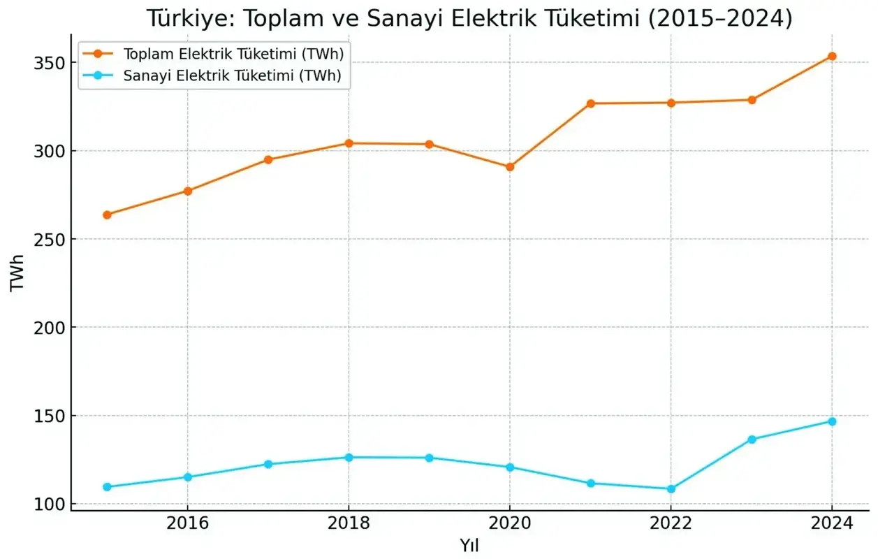 2015’te 263 TWh olan toplam elektrik tüketimi, 2024’te 353,6 TWh’ye yükselmiştir. Sanayi sektörü bu toplamın her yıl yaklaşık %41–45’ini oluşturmuş, yani payını korumuştur. Toplam tüketim artarken sanayi payının sabit kalması, sanayi hacminin reel olarak gerilediği değil, en az aynı oranda büyüdüğü anlamına gelir. Üstelik 2021 ve 2022 yıllarına ait TEİAŞ verileri, sanayi tüketiminin sırasıyla 111,5 TWh ve 108,3 TWh civarında seyrettiğini göstermektedir. Pandemi ve enerji fiyat şoklarının yaşandığı bu dönemde dahi üretim seviyesi güçlü kalmıştır.
